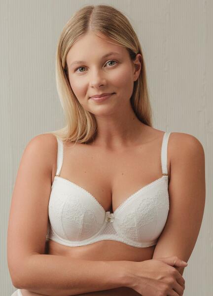 Push up melltartó - virágos csipke csészék béléssel - kivehető push-up párnázás - függővel ellátott szatén masnival díszített hátsó ülés - a pántok levehetők és állíthatók - dupla hálós heveder oldalcsontokkal - rögzítés két kampóval, háromszintes szabályozással Összetétel: 63% poliamid, 24% pamut, 13% elasztán